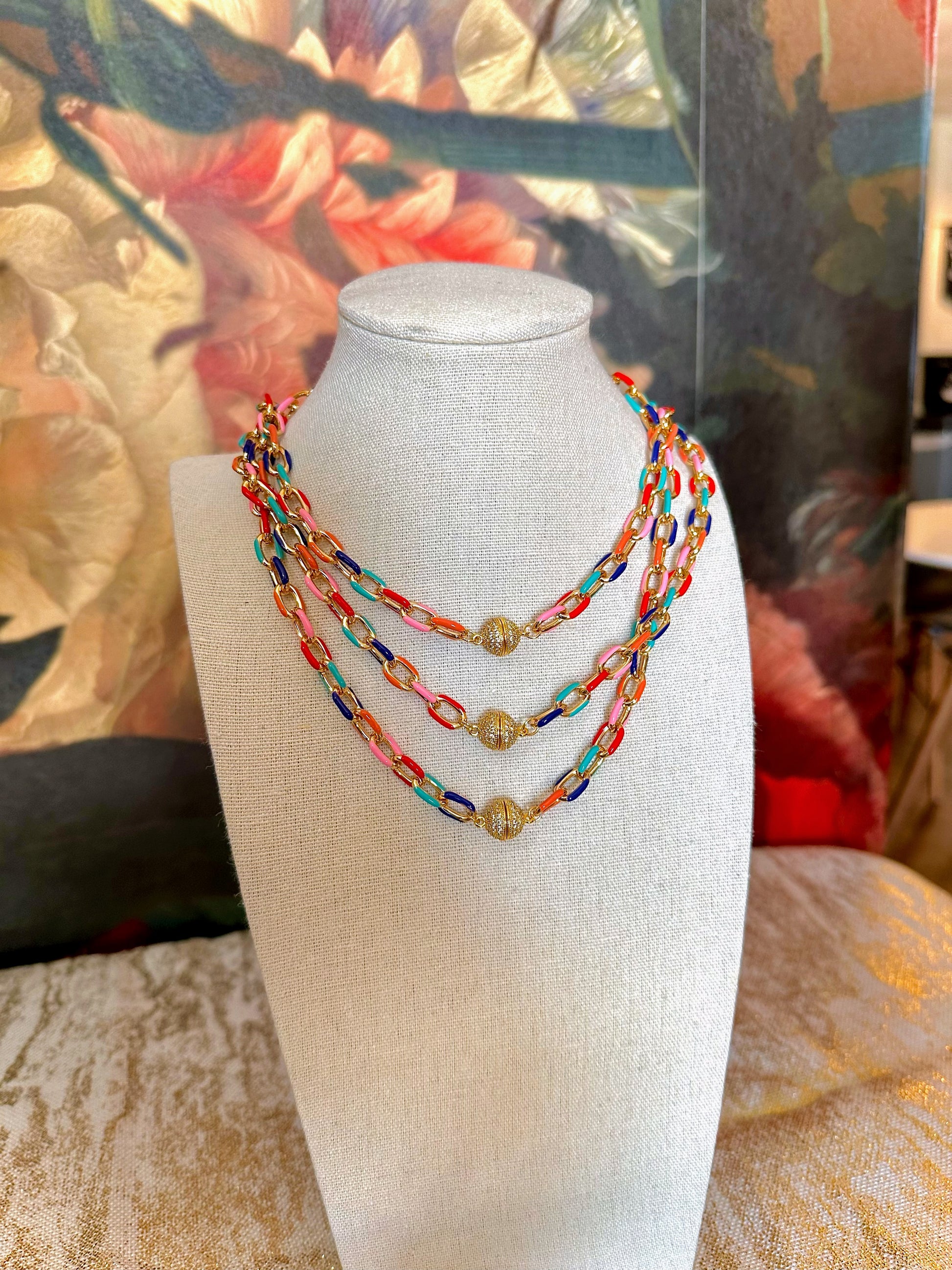 The Happy Days Choker is a vibrant, colorful 16-inch chain necklace that adds a playful pop to any outfit. Featuring a sparkling rhinestone magnetic clasp, it’s easy to wear and perfect for brightening up your everyday look.